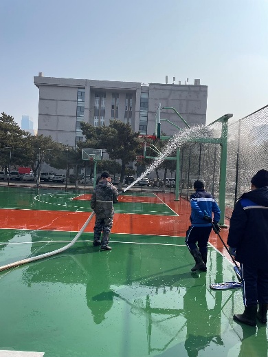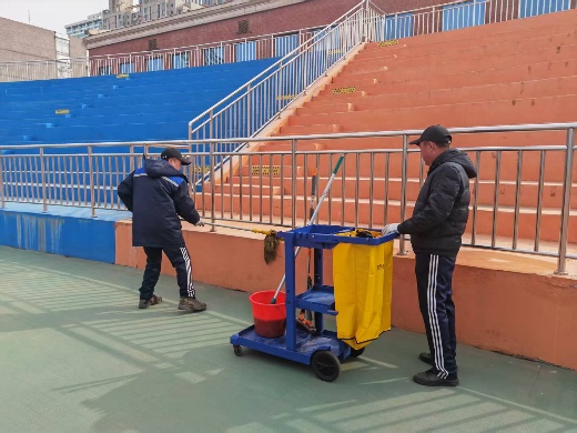 日常工作中严格执行场地保洁制度,定期清扫场地杂物,为师生提供干净舒适的运动环境。针对近期风沙较大的天气情况,保洁定期对篮排球场地面进行了全面刷洗,确保场地清洁安全。