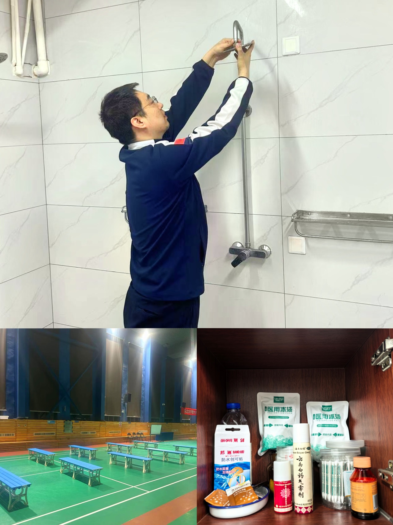 检查更衣室、淋浴间各项服务设施,确保通风良好,服务设施完好;增设休息区,裁判区,蓝色调的场地布局提升比赛的舒适度与观赏性;备好冰袋、止痛喷雾等,应对运动损伤。