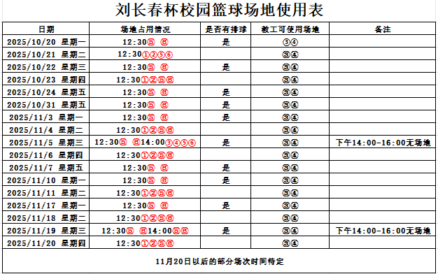 20251020星期一)—11月20日(星期四)期间,因馆内有第六届“刘长春杯”校园篮球赛,需要使用中午教工免费时段及学生免费时段的部分场地在此期间活动场地会做出相应的调整。因11月20日之后的比赛时间尚未确定,11月21日之后的场地使用安排,将另行通知。